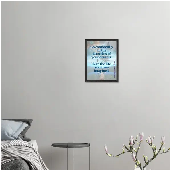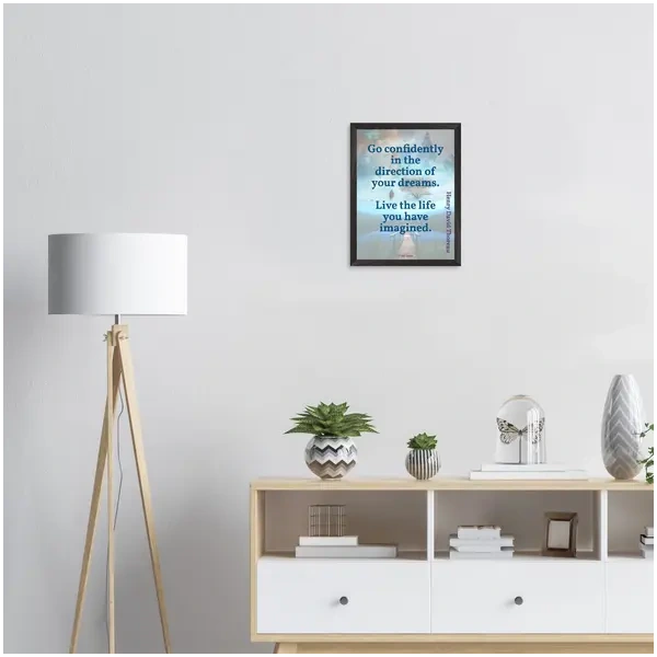 This premium framed matte print presents the uplifting quote by Henry David Thoreau on smooth, luxuriously soft paper in a matte finish. The paper is heavier (200 gsm), with a thickness of 0.26mm for durability, and is Forest Stewardship Council (FSC) certified (or equivalent) for sustainable printing and the responsible management of forests. The print quality is exceptionally sharp and in vivid colour. The print is framed using responsibly sourced oak or ash wood and is ready to hang.